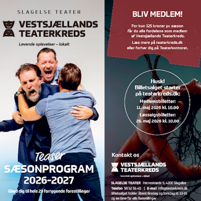 Vestsjællands Teaterkreds inviterer igen i år alle medlemmer (sæson 2025-2026) til en festlig aften på Slagelse Teater, hvor sæsonprogrammet for 2026-2027 vil blive præsenteret.